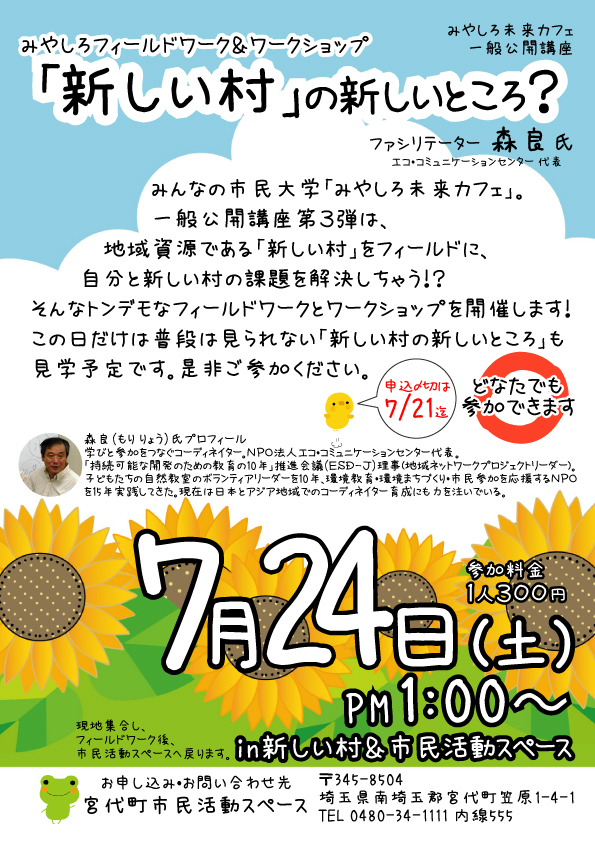 分かりやすい町の職員さんと、熱い暑い柳田先生に続いては、「新しい村の新しいところ?」。エコ・コミュニケーションセンター(ECOM)の森先生にお越しいただき地域資源である「新しい村」でフィールドワーク&ワークショップです。新しい村の島村社長さん自らご案内いただきます。次回もお楽しみに!!